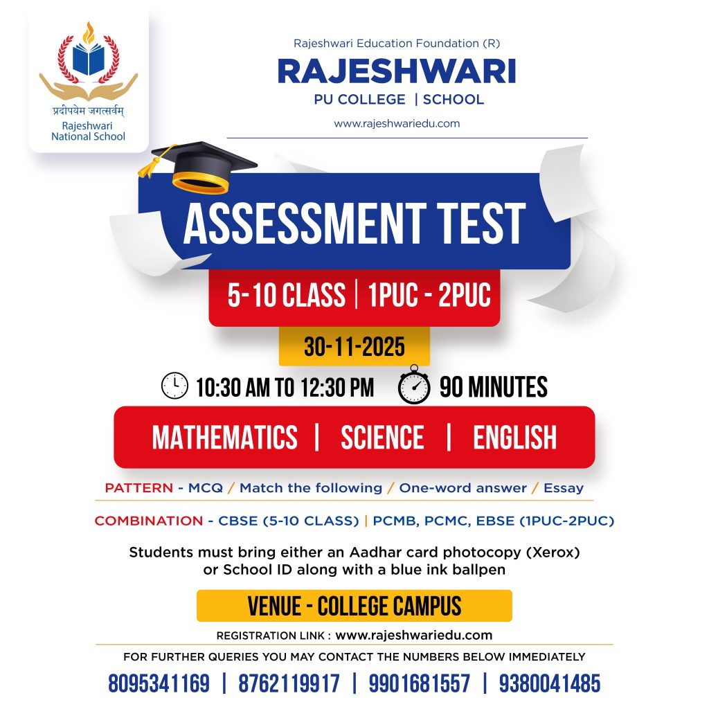 Rajeshwari National School provides a comprehensive education from 1 to Grade 10, integrating academic excellence with Bharatiya values. With state-of-the-art facilities, a structured curriculum, and experienced faculty, we foster intellectual growth, character development, and holistic learning, preparing students for a successful future.